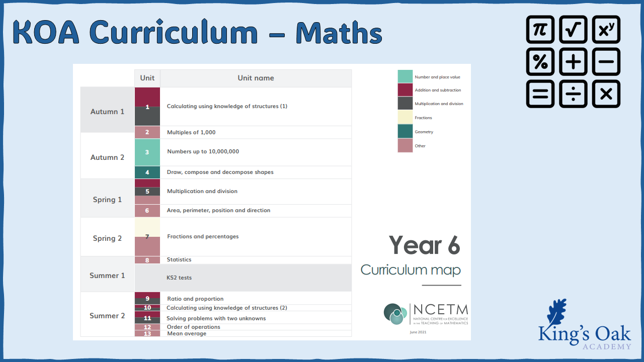 Maths is taught on a daily basis in Years 5 and 6. Our main focus in Maths lessons is on reasoning and our children have many opportunities to develop their oracy skills through these lessons, discussing, exploring and explaining. Maths in Years 5 and 6 includes a range of opportunities to use manipulatives to develop, demonstrate and make links across their learning. In Years 5 and 6. we also continue to develop fluency in multiplication and in the various written methods.