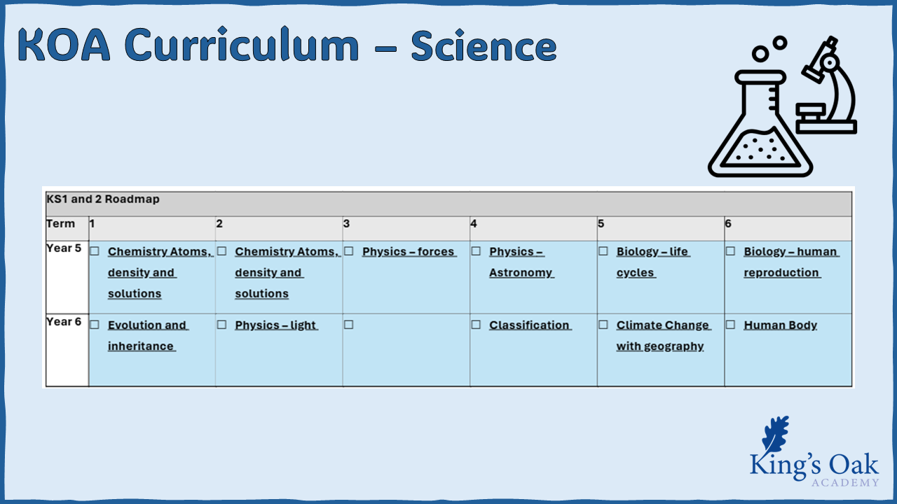 - Through our Science units, we discover how atoms and particles make up every single thing in our universe. We study our circulatory and respiratory systems – and even make our own fake heart, lungs and blood – to understand how oxygen travels around our bodies to keep us alive.