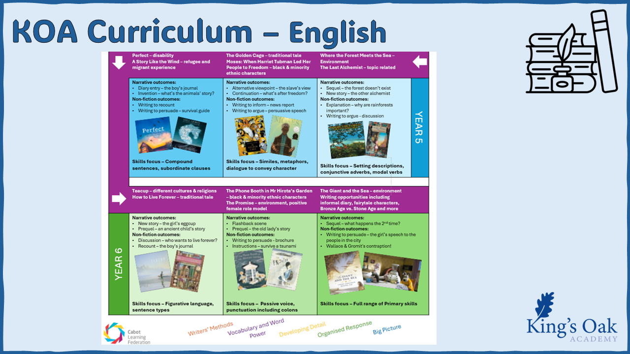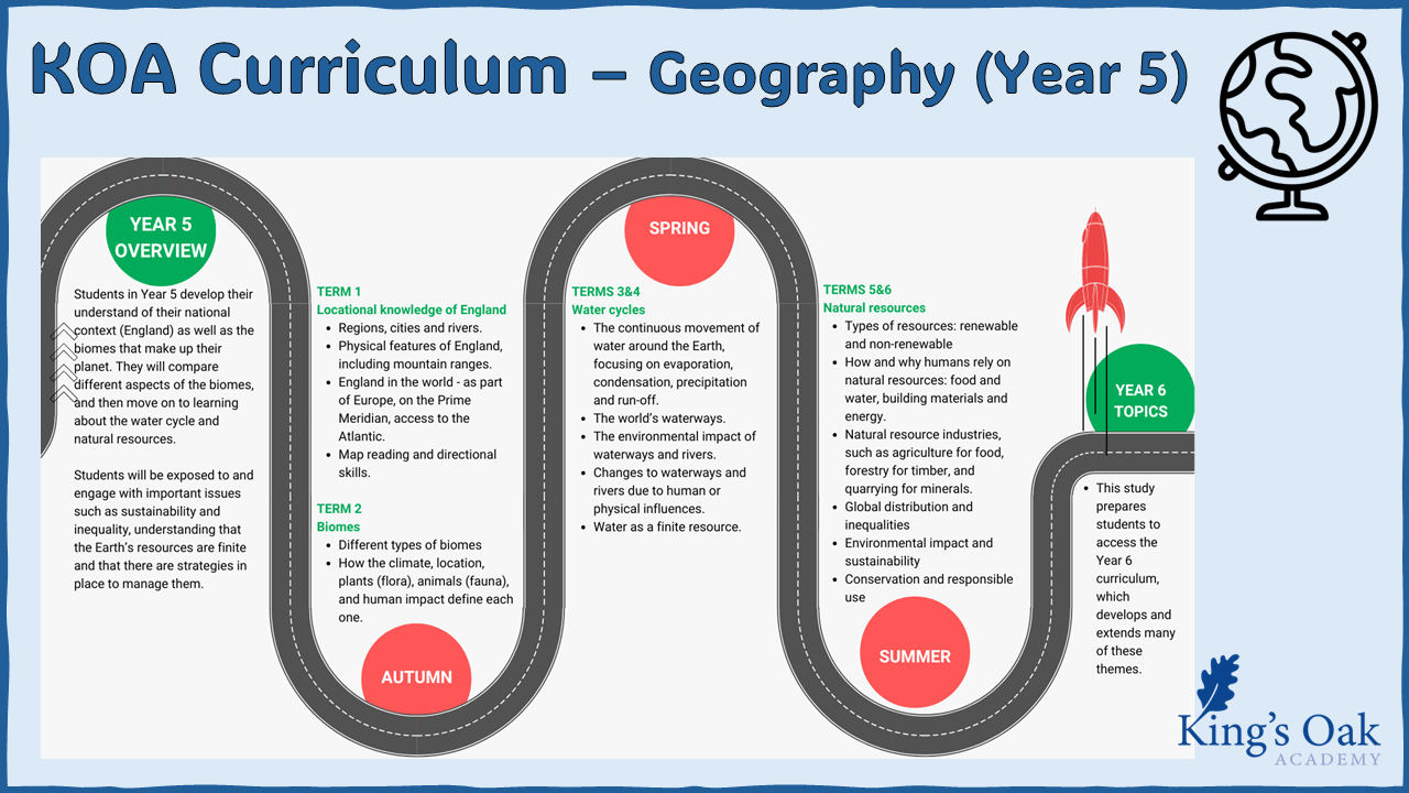 Welcome to Year 5 at KOA, where we support our children to Work Hard and Be Kind. In our classrooms (both inside and out), we consistently use our gem powers to encourage our children to focus well and gain new knowledge and skills. Learning across the curriculum is taught through the use of Key Questions (called ‘Enquiry’); our reading and writing is taught through our exciting texts then is applied and embedded within our states of being. As well as academic learning, we also ensure that our children are supported in developing personal, social and emotional skills.