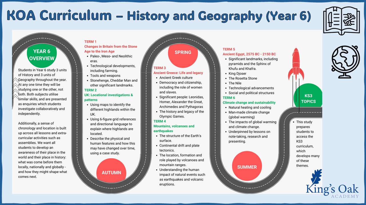 Welcome to Year 6 at KOA, where we support our children to Work Hard and Be Kind. In our classrooms (both inside and out), we consistently use our gem powers to encourage our children to focus well and gain new knowledge and skills. Learning across the curriculum is taught through the use of Key Questions (called ‘Enquiry’); our reading and writing is taught through our exciting texts then is applied and embedded within our states of being. As well as academic learning, we also ensure that our children are supported in developing personal, social and emotional skills.