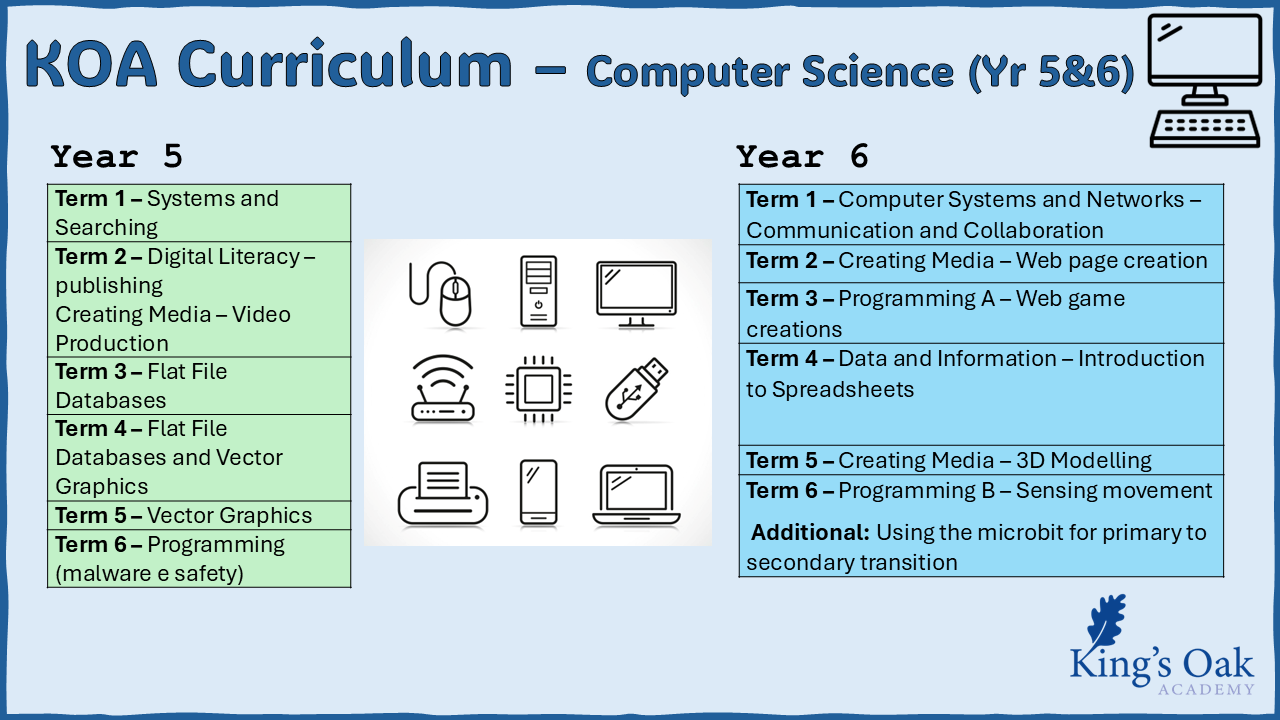 The Year 5 and 6 Curriculum is enriched with weekly access to specialist classrooms classroom and subject-expert teachers for Computing, PE, Art and Design and Technology. This enrichment is designed to enable our Year 5 and 6s to foster relationships with a wider range of teachers, who will guide them through the next steps in their education; this also allows our children entering the younger years of Middle School to begin to explore a little more of the site, while still being supported with the usual class teacher support in place, as appropriate for primary-aged learners.